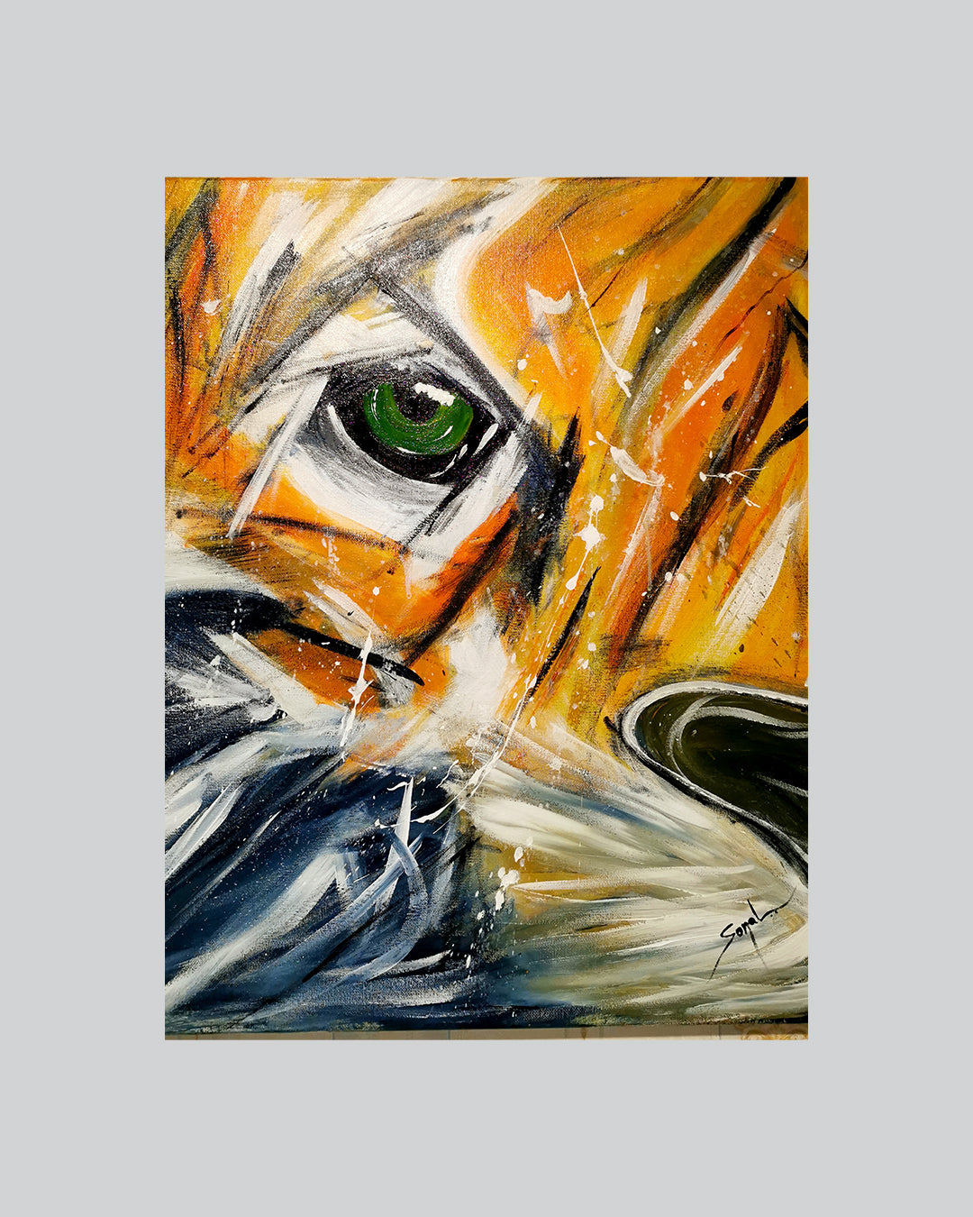 Artist Sonal has always been attracted to this beautiful creature who is strong, brave and Gorgeous. Tiger has been portrayed in diverse forms by Sonal. The green eyes are always prominent in her art. It grips the viewer and has a hypnotising effect.