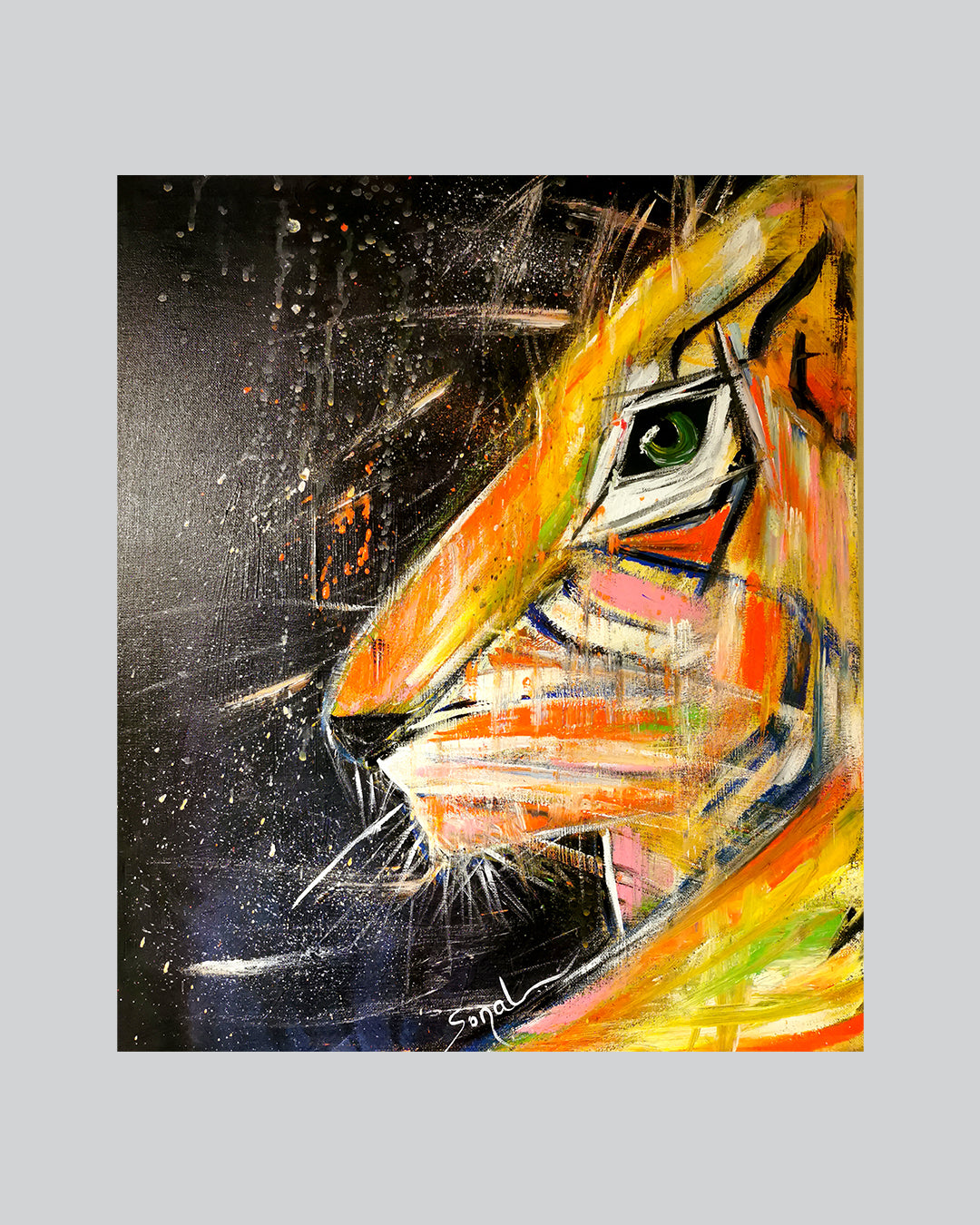 Artist Sonal has always been attracted to this beautiful creature who is strong, brave and Gorgeous. Tiger has been portrayed in diverse forms by Sonal. The green eyes are always prominent in her art. It grips the viewer and has a hypnotising effect.
